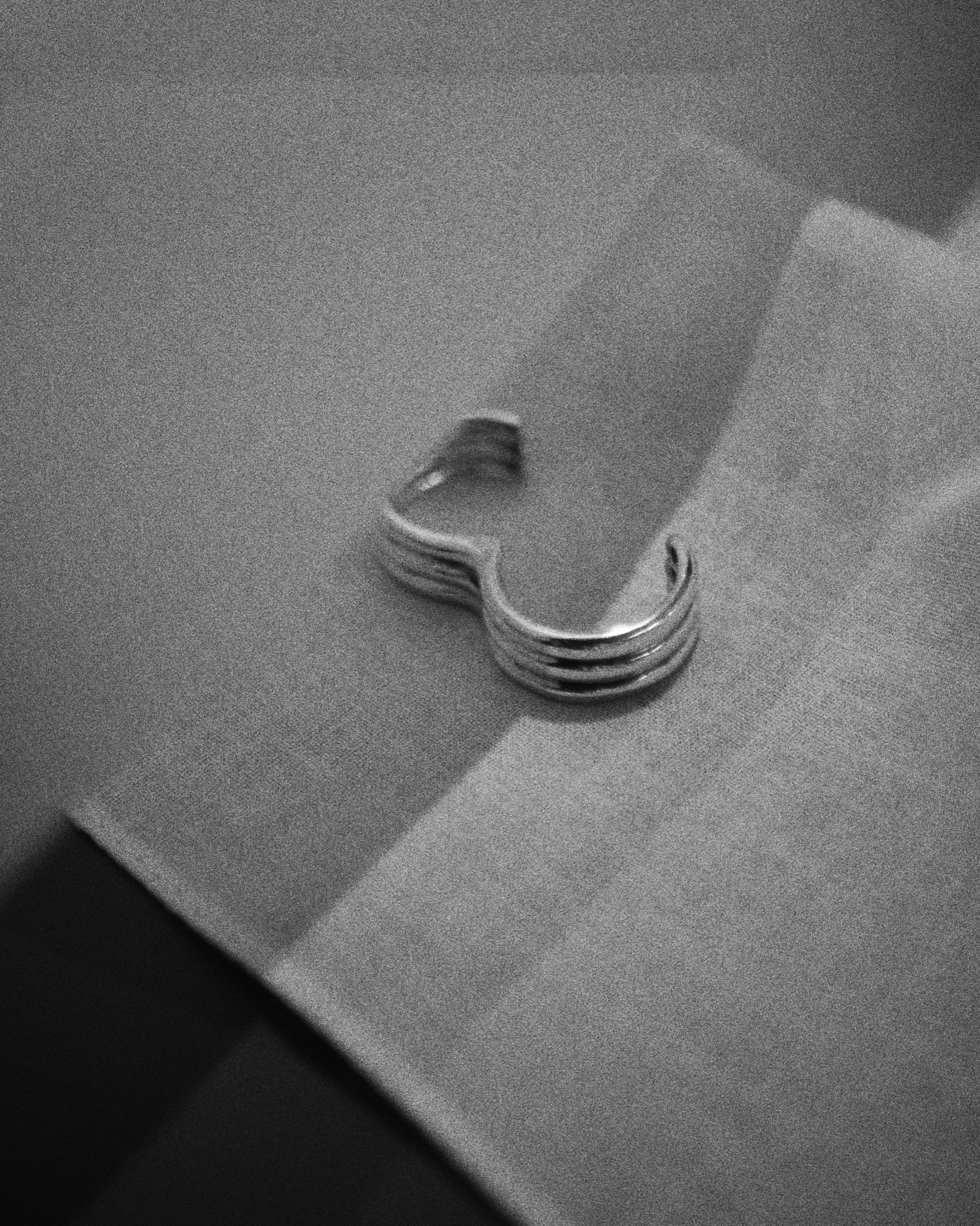 This double ring was created by focusing on arched metal fittings used for fastening strings from clothing materials and reconstructing them as jewelry.