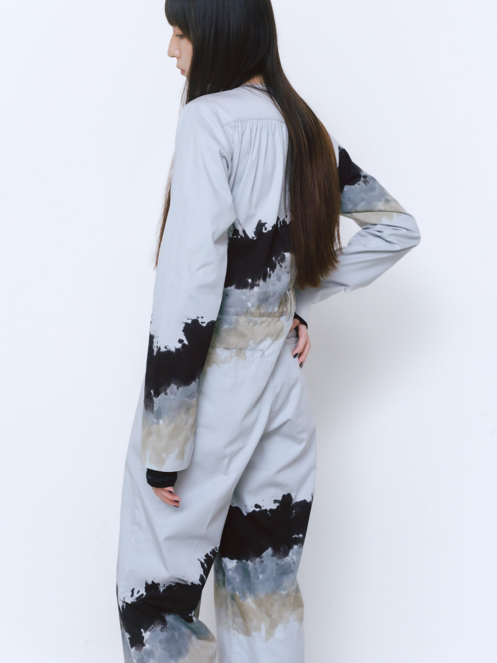 This season, inspired by Yasui Yoshinao's lithographs, the collection boldly features jumpsuits hand-dyed with paint.