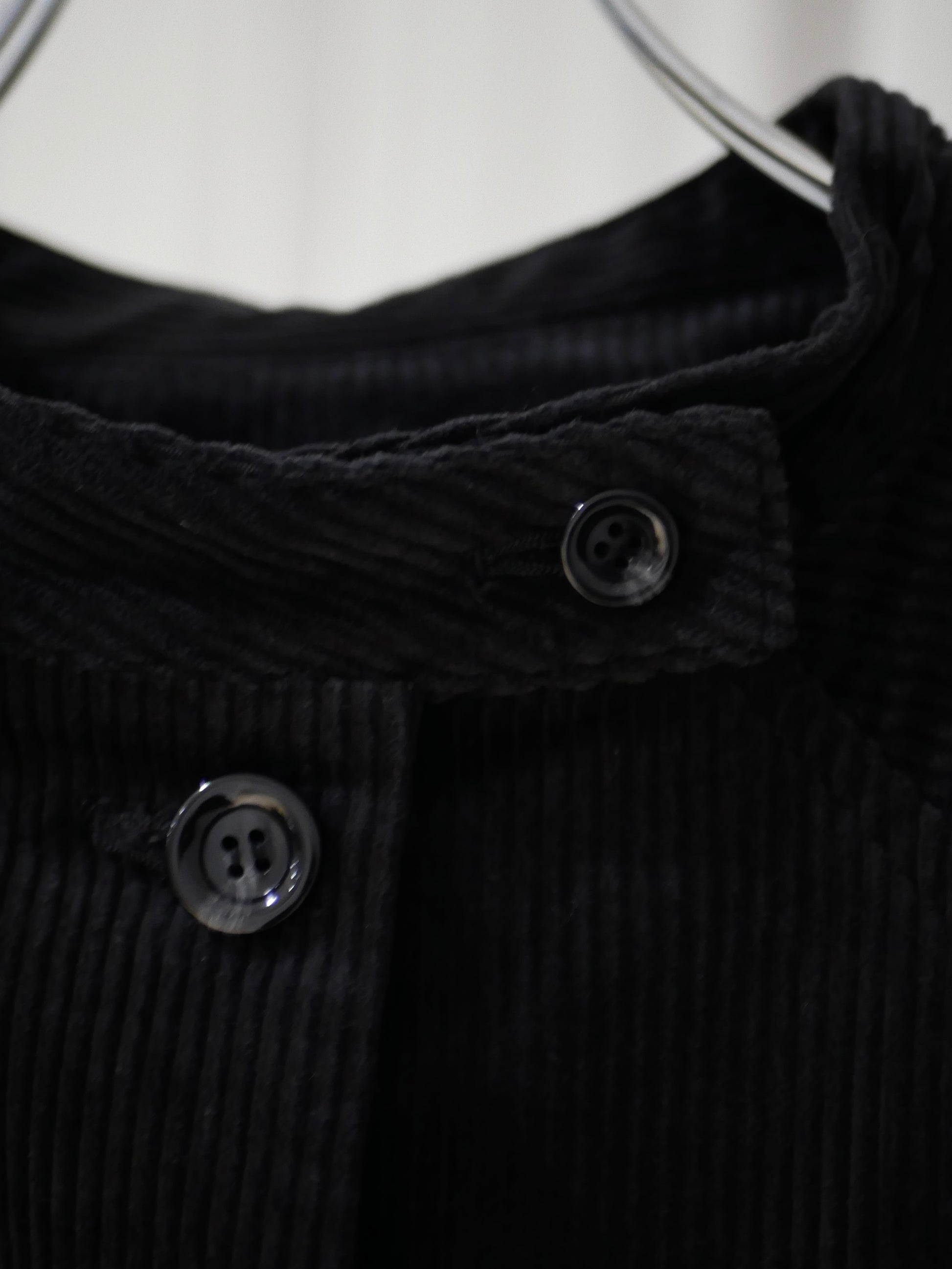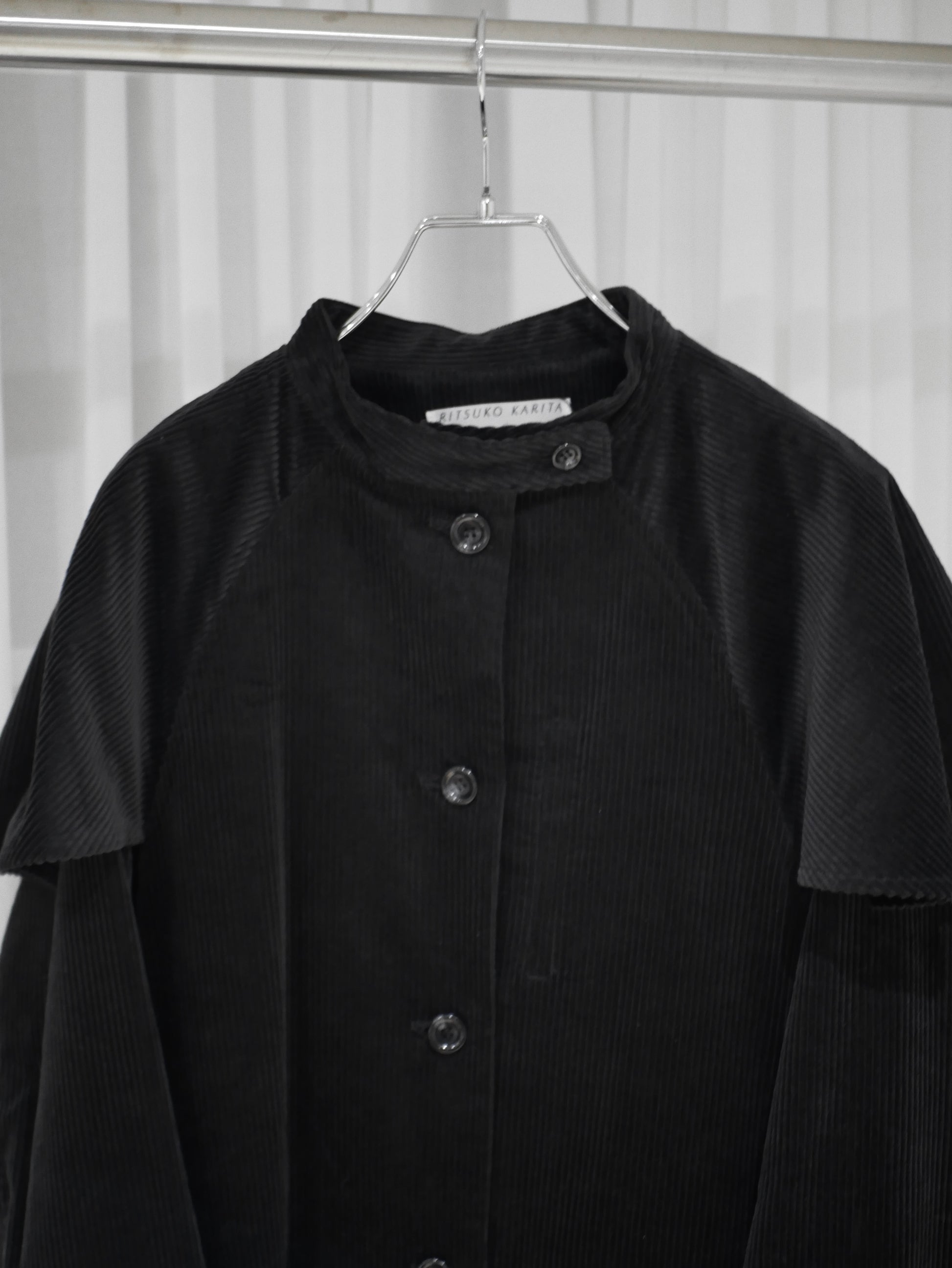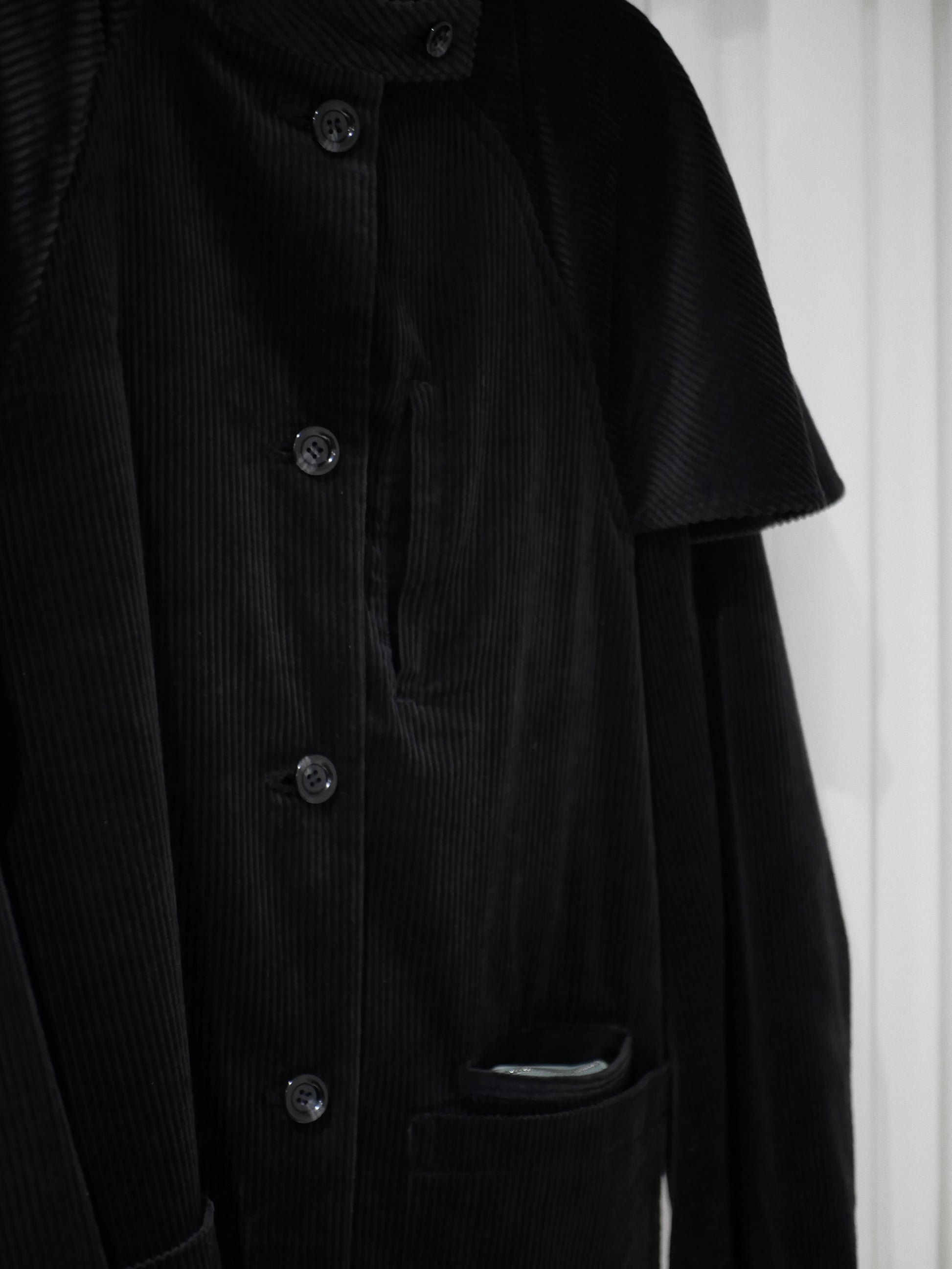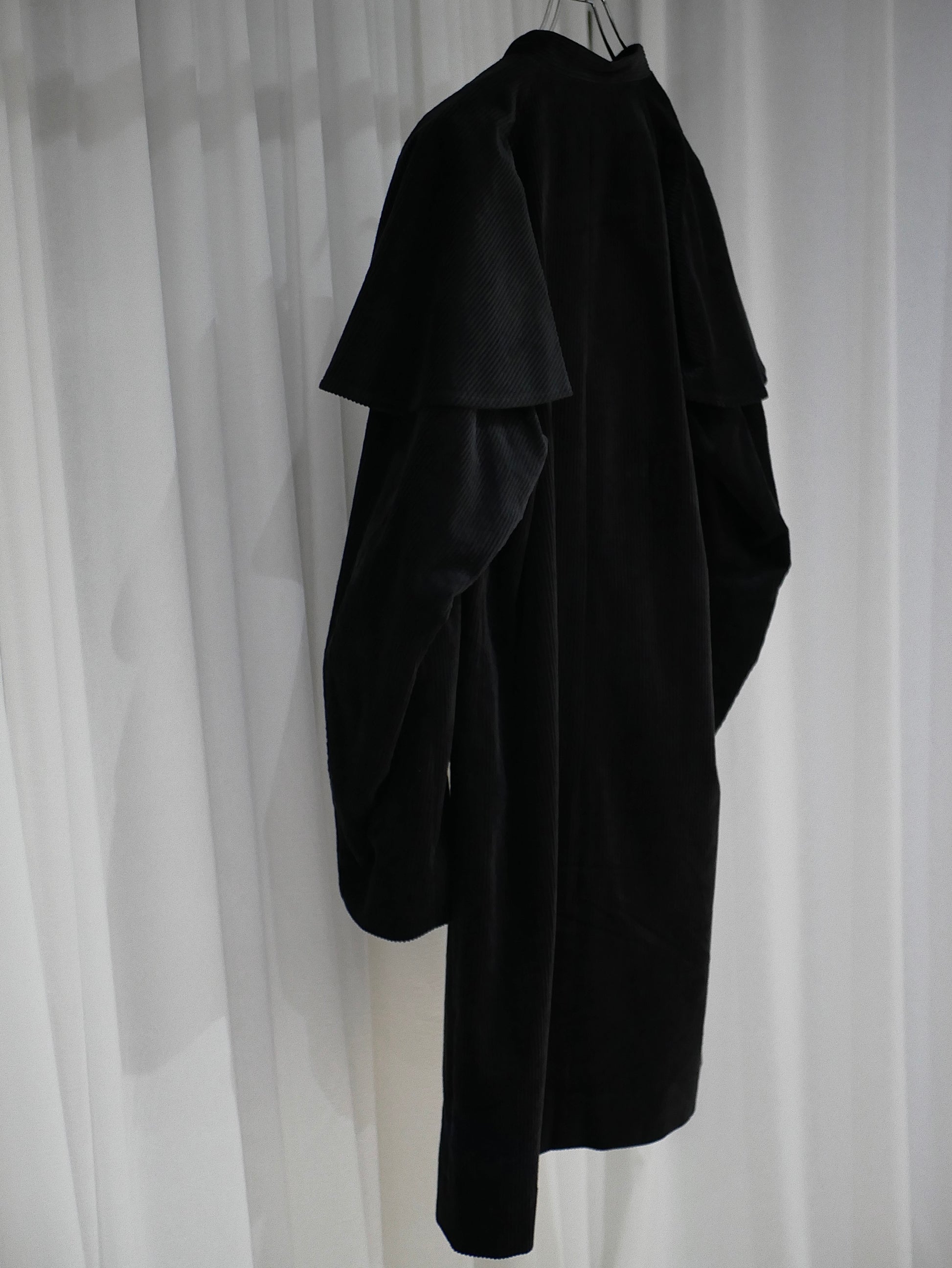 This compact outerwear has a one-piece silhouette and striking flared shoulders. The buttons, pockets, and texture incorporate masculine elements. The purple-gray version is made of original wool, while the black version is made of corduroy. (The purple-gray version is available on a separate page.)