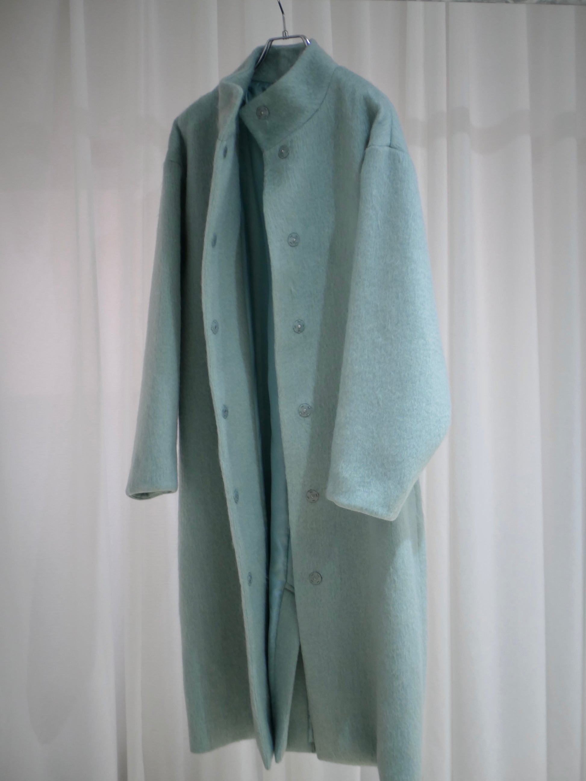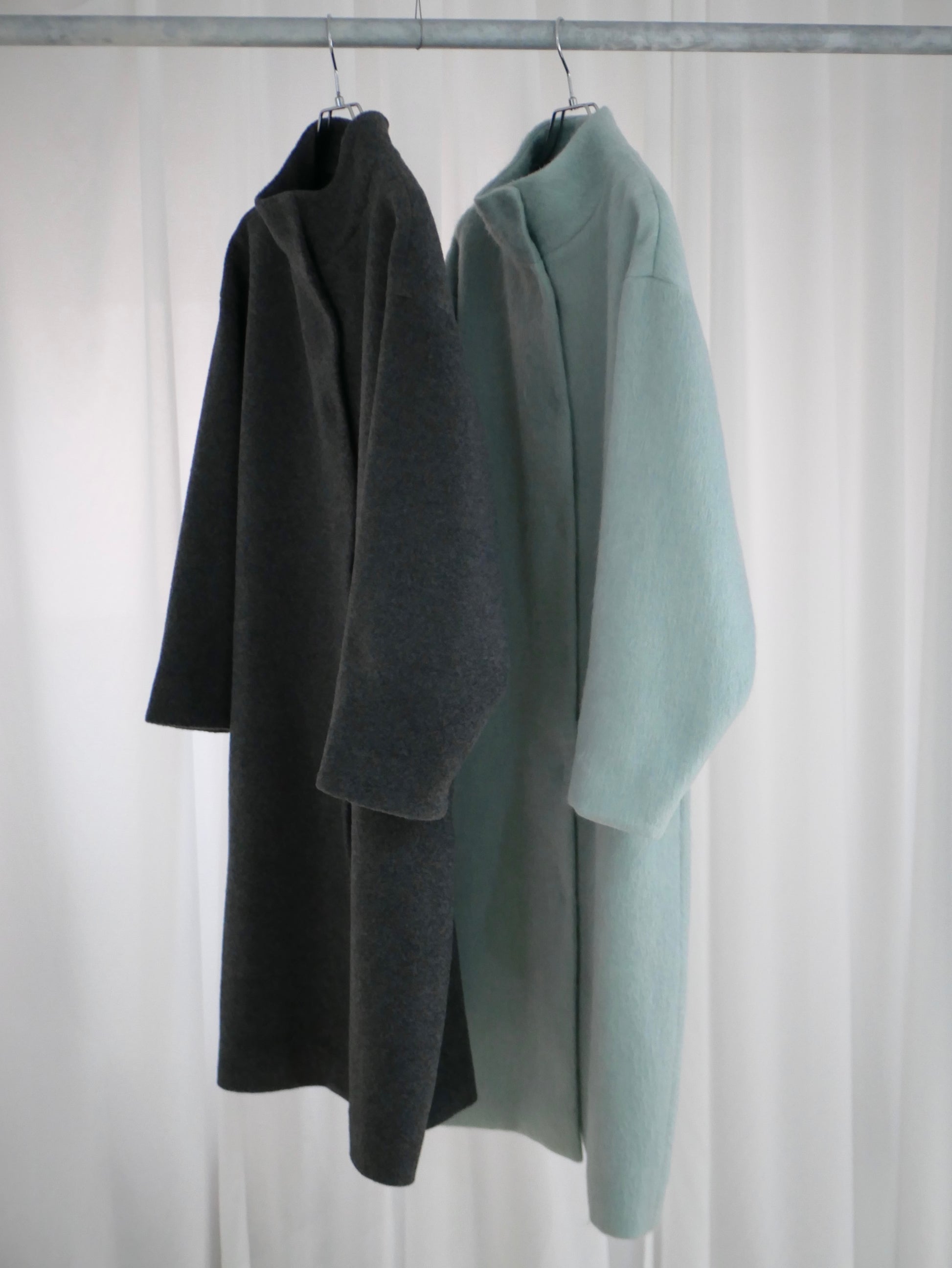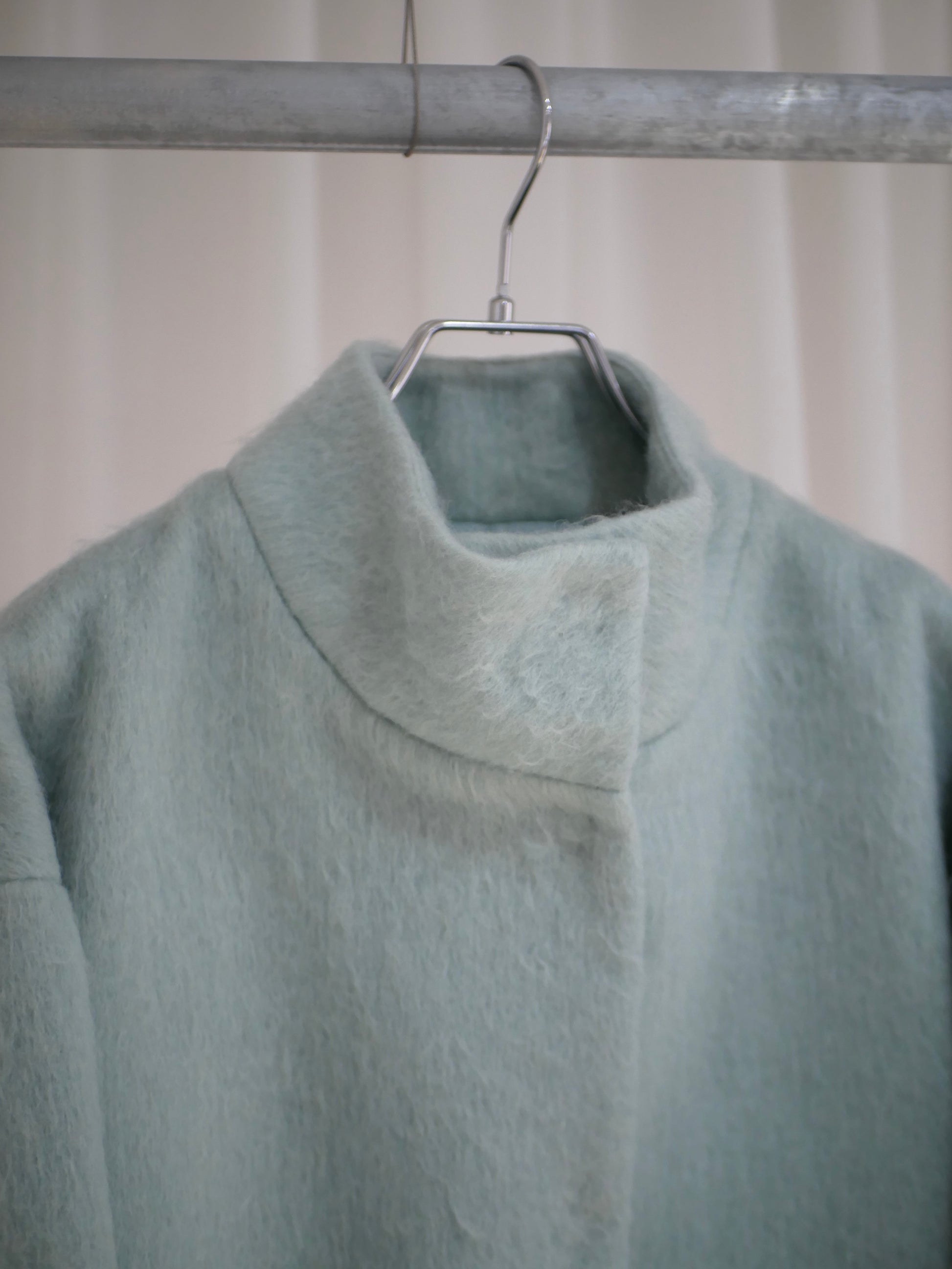 毛布に包まれるような、丸みを帯びたシルエットのコート。毛足の長さが生む柔らかな存在感。マフラーやベルトを加えて、装いの変化も楽しめます。目立つディテールはないけれど、静かに空気を纏うような佇まいのある一着です。