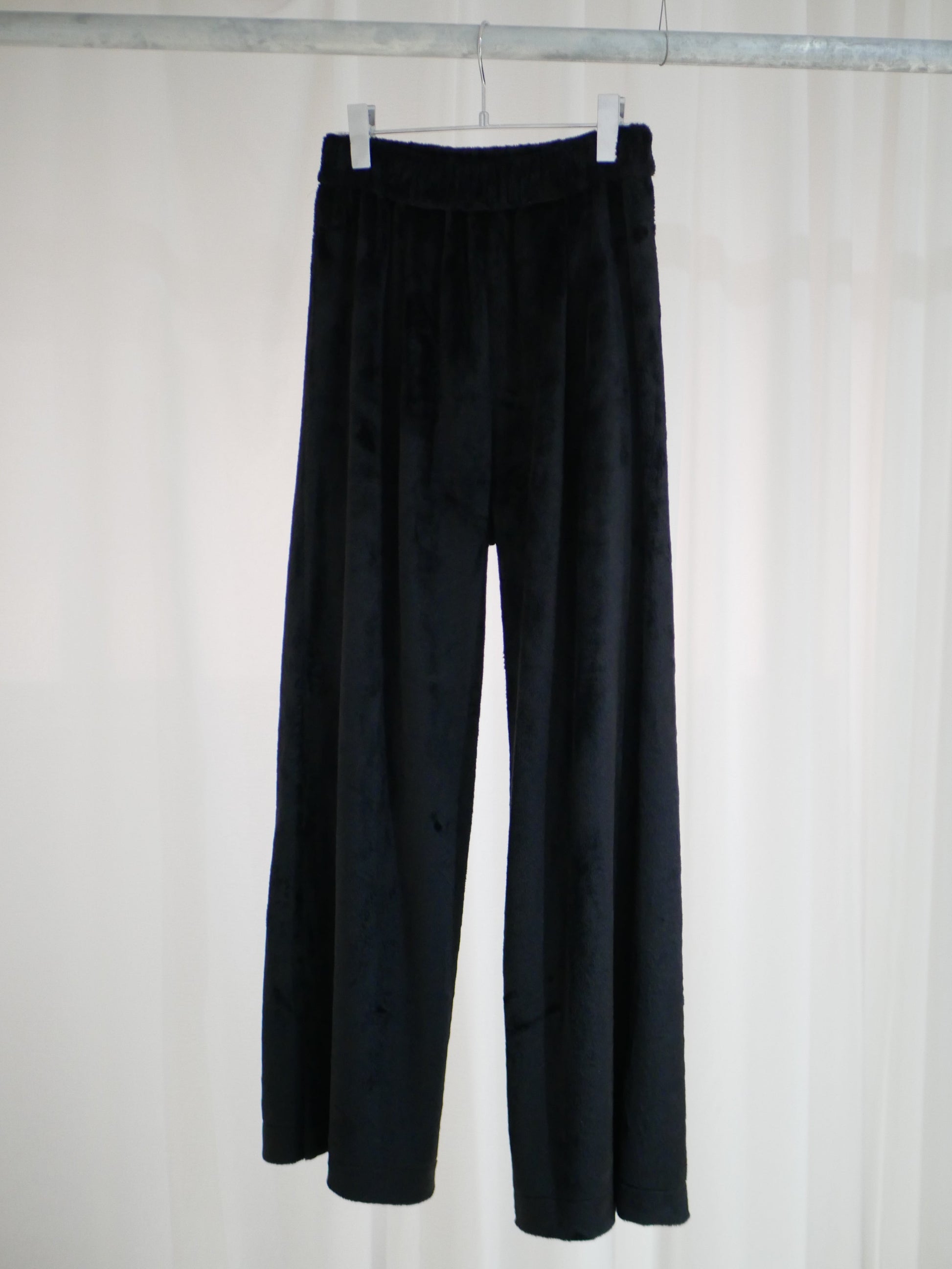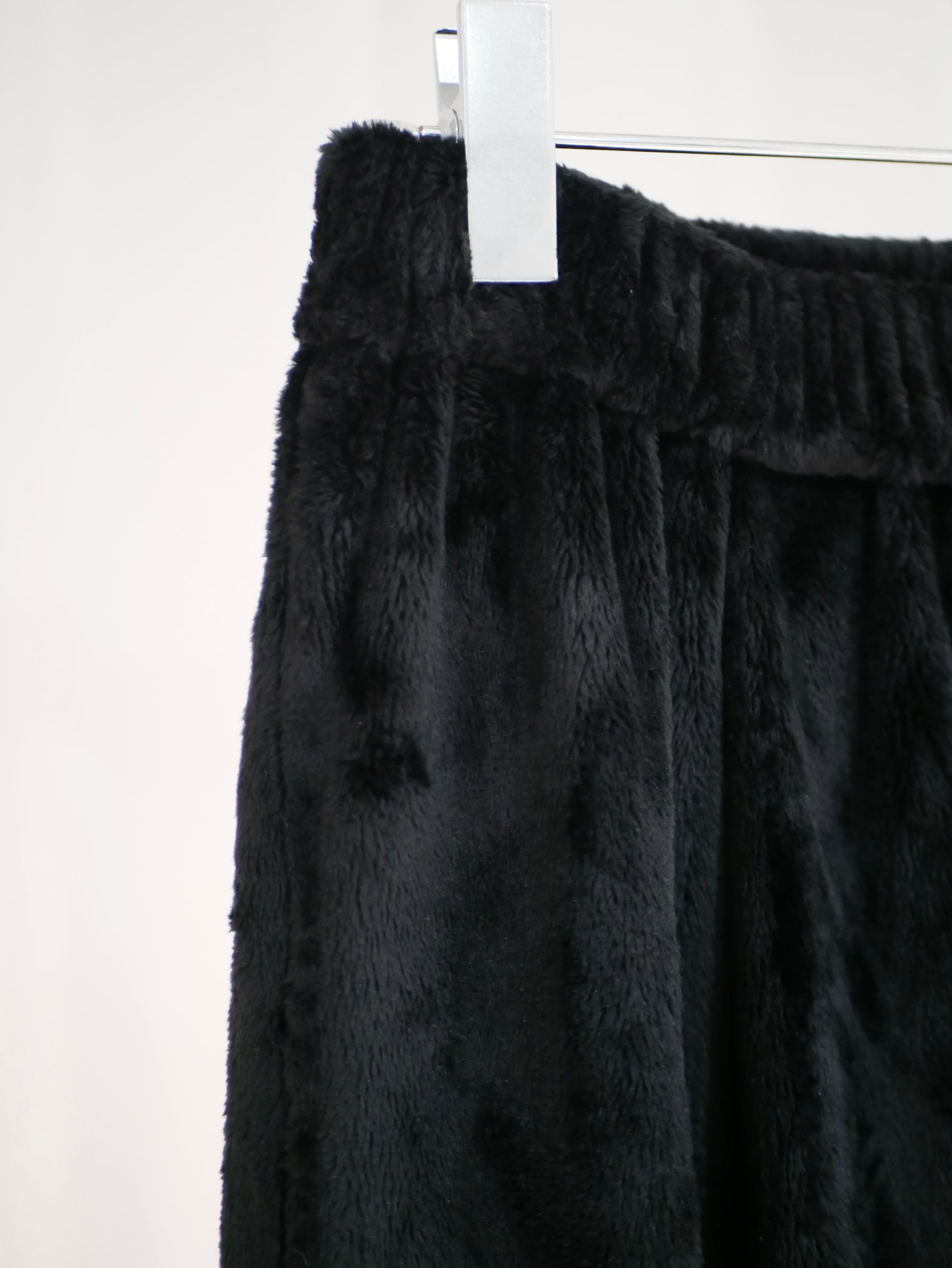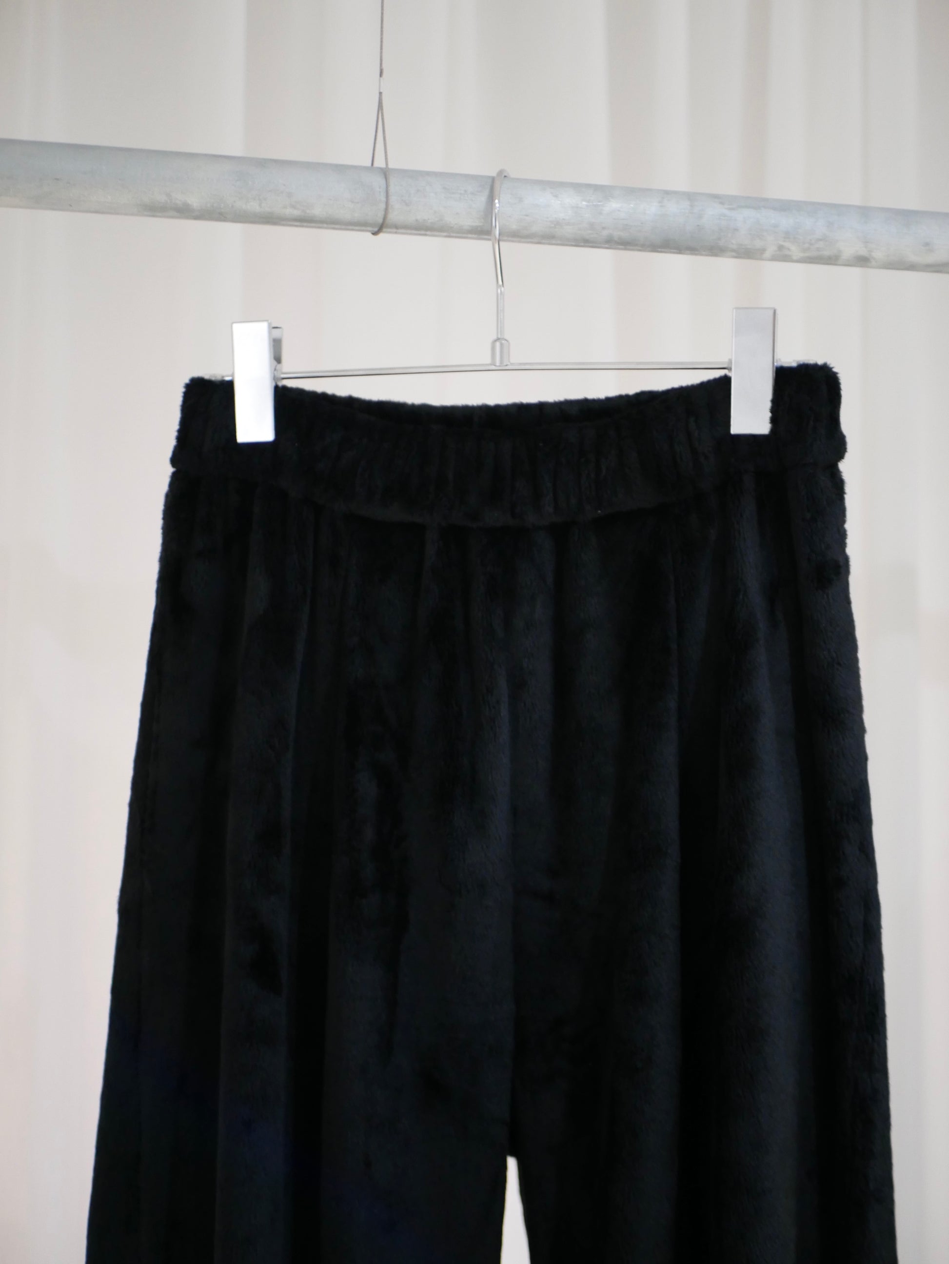 猫の毛並みを想起させる、やわらかであたたかなボア素材のイージーパンツ。たっぷりとしたシルエットとウエストゴム仕様で、ストレスフリーな着心地。