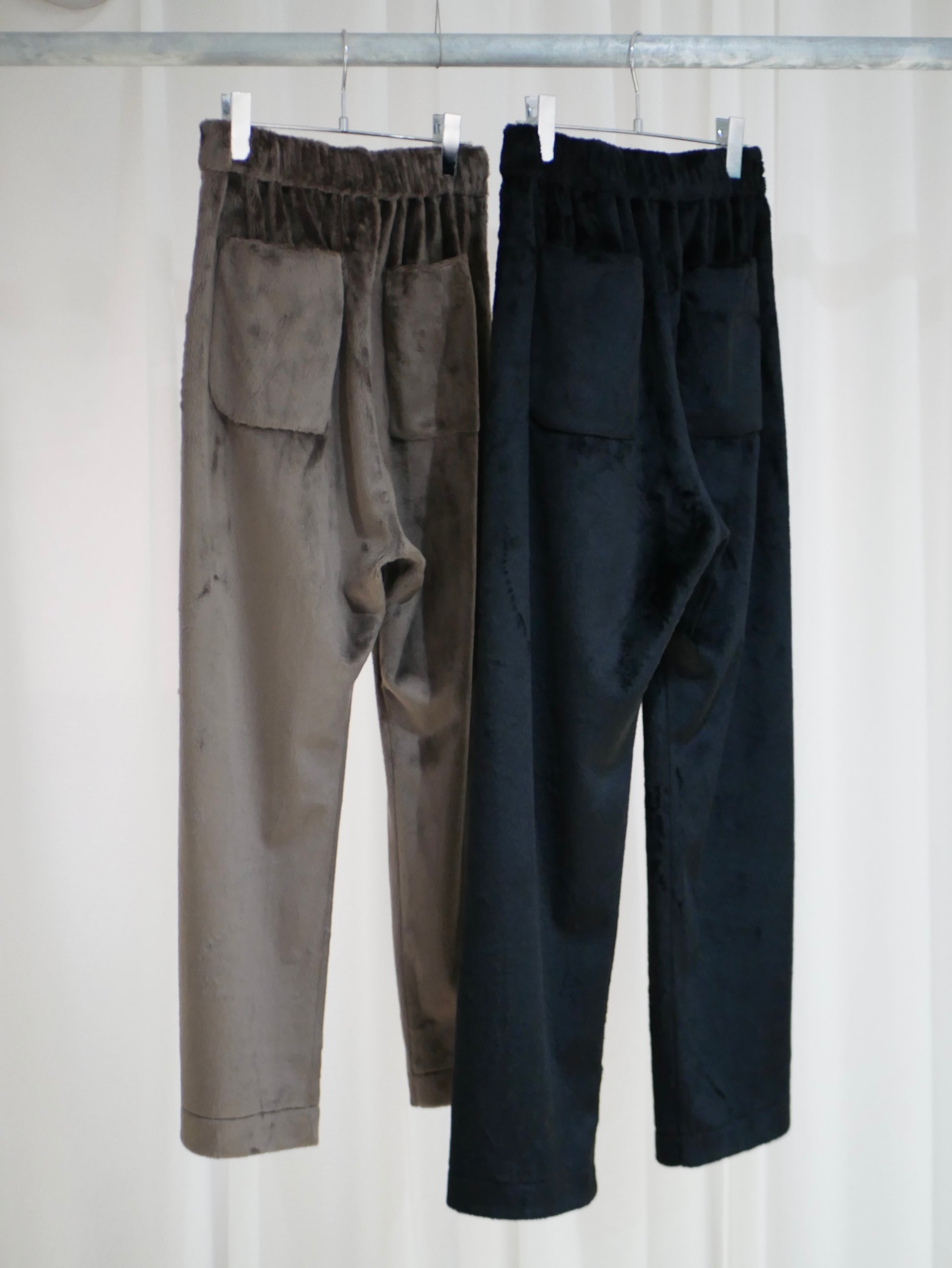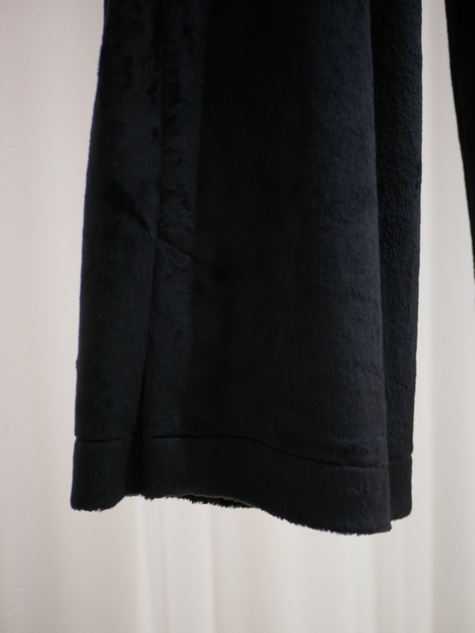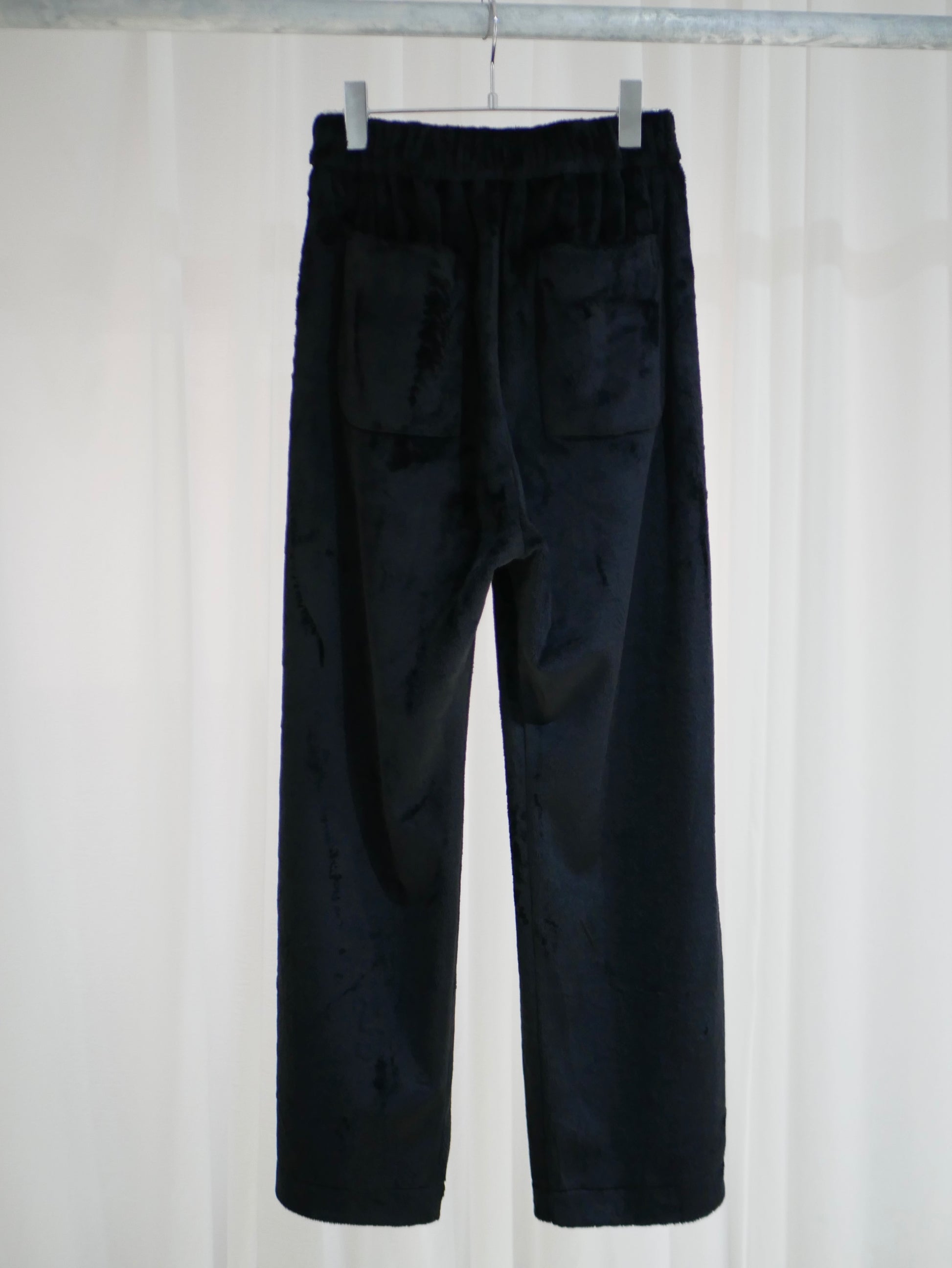 猫の毛並みを想起させる、やわらかであたたかなボア素材のイージーパンツ。たっぷりとしたシルエットとウエストゴム仕様で、ストレスフリーな着心地。