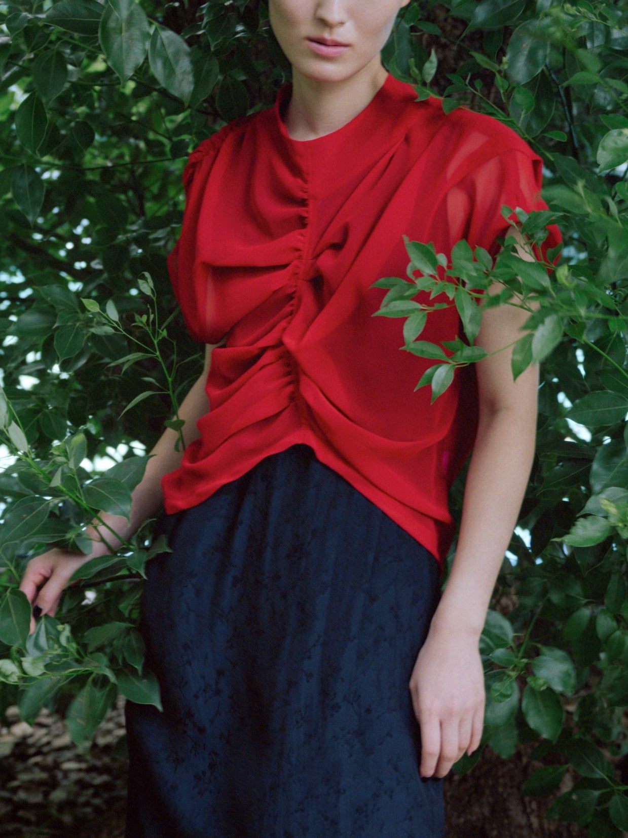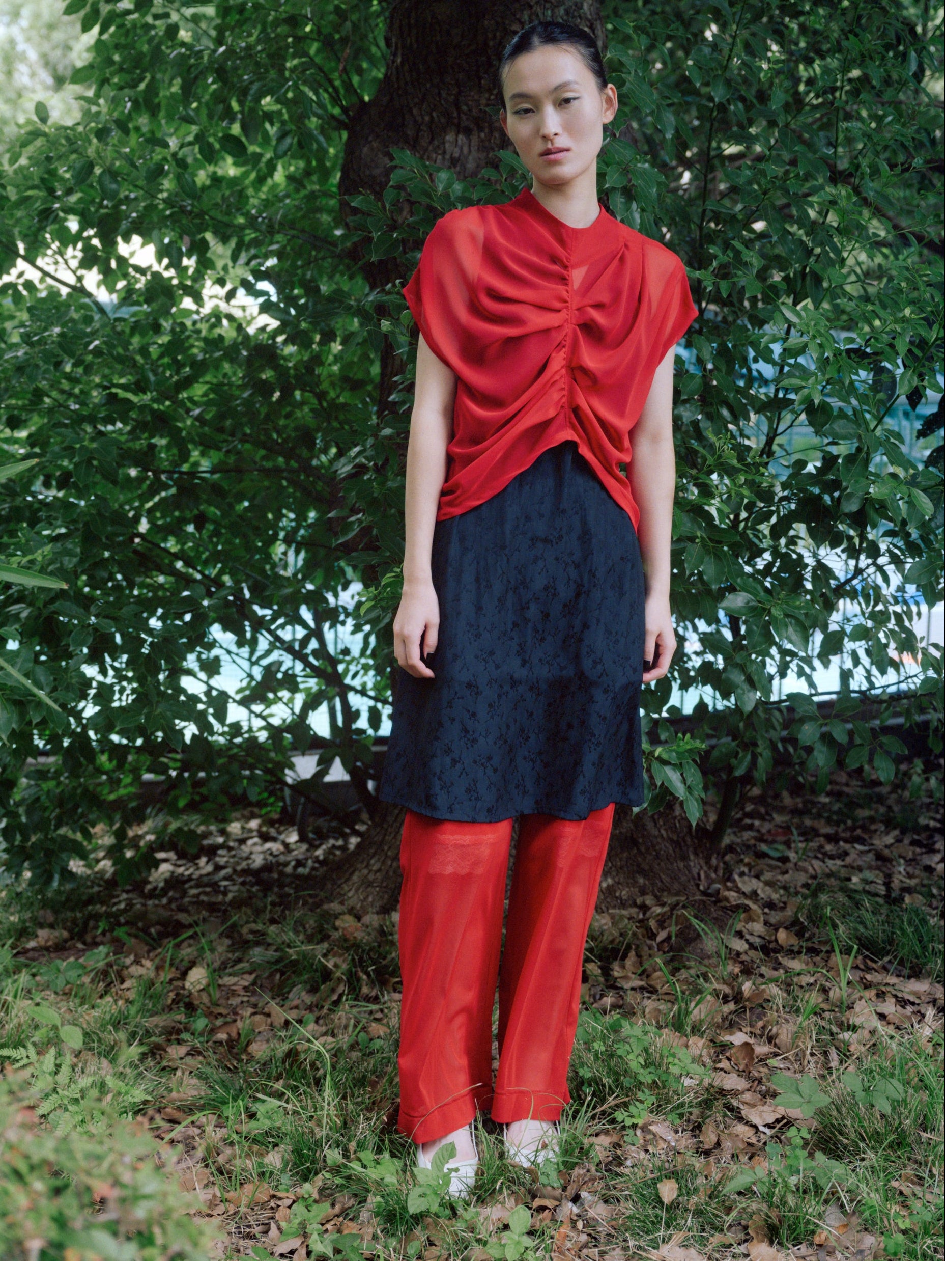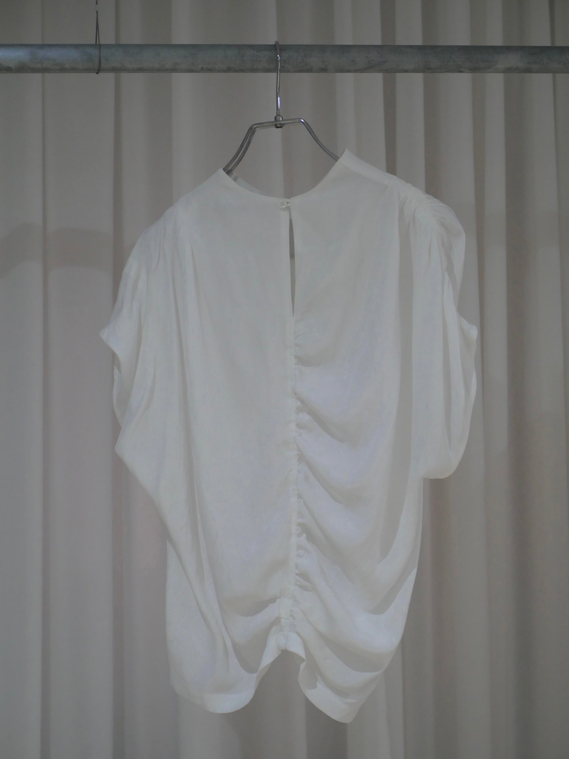 ギャザー・タック・ドレープmixのトップス。3色は透け感のある柔らかなシフォン。白はジャガード織りによるほんのり花柄が浮かぶ生地の2種。1枚でトップスとして着るのは勿論、ワンピースの上にレイヤードするのもおすすめです。交差する曖昧な気持ちを表現。