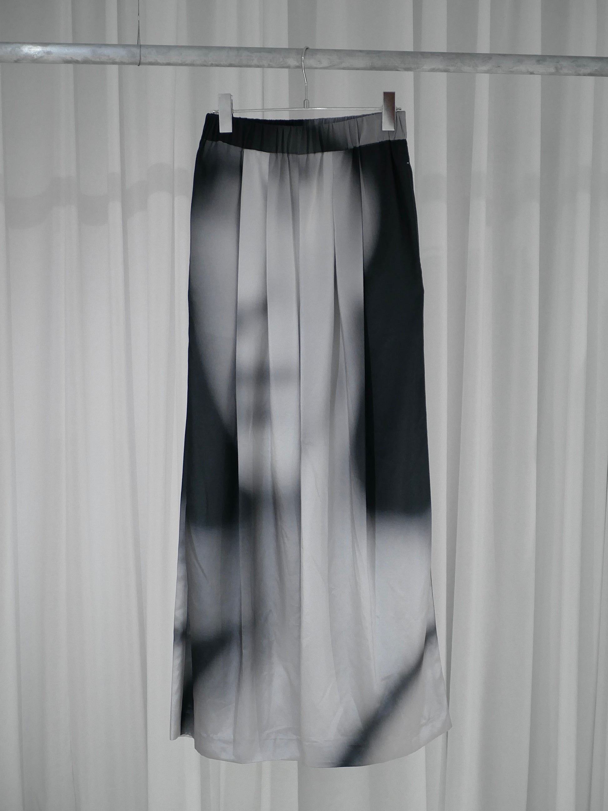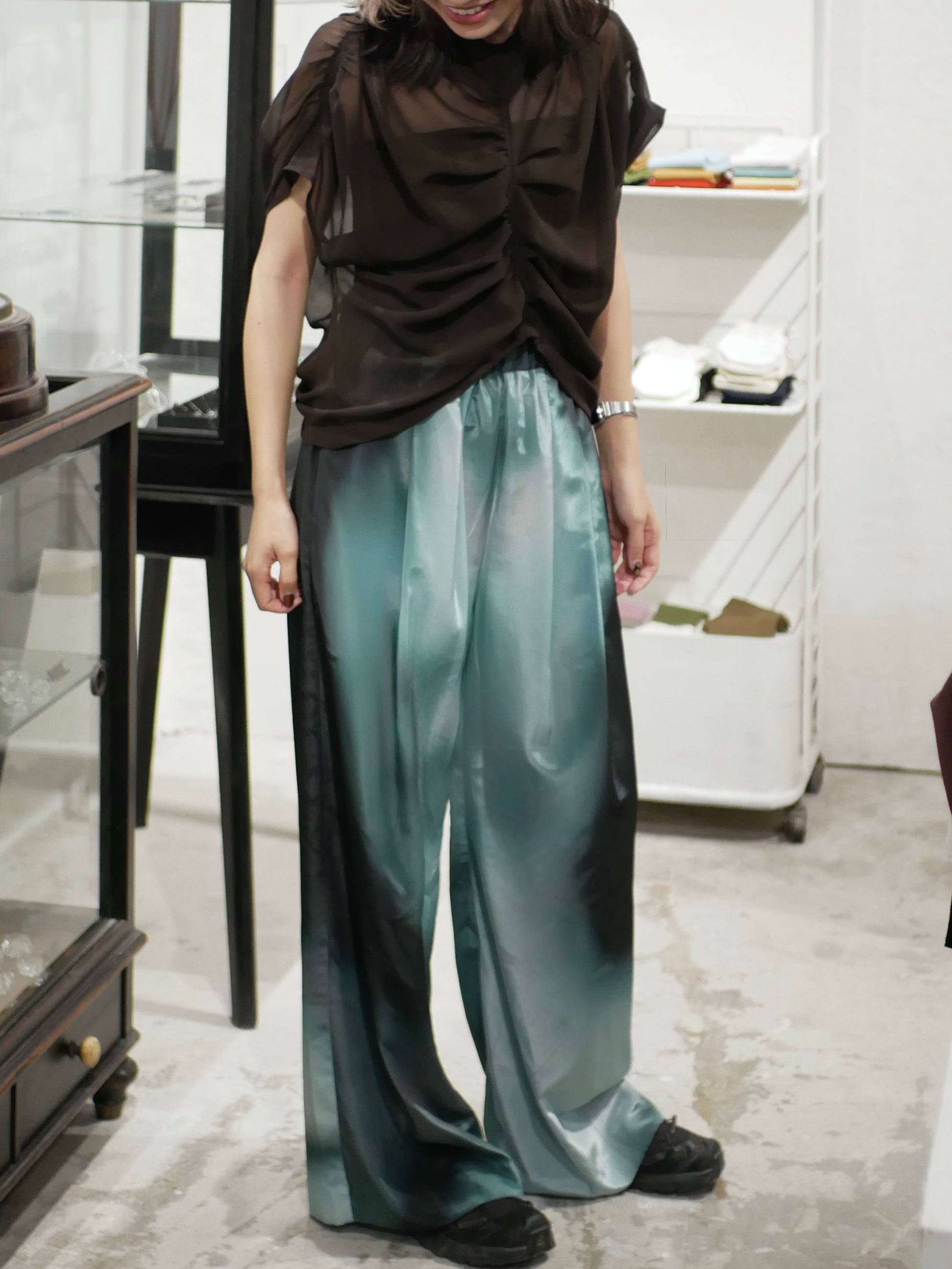今回インスピレーションを受けた画家、エリザベス・グラスナーの描く身体が緑の人間。また、村上春樹の作品を読み、妖美な人影を感じるテキスタイルを纏えたらと思い制作に至りました。近くで見たらグラデーション、遠くから見ると顔が浮かびあがります。ゴムパンツのため、着丈が合えばメンズでも着用可能です。夏の暑い日に涼しく軽く、印象的なボトムスです。