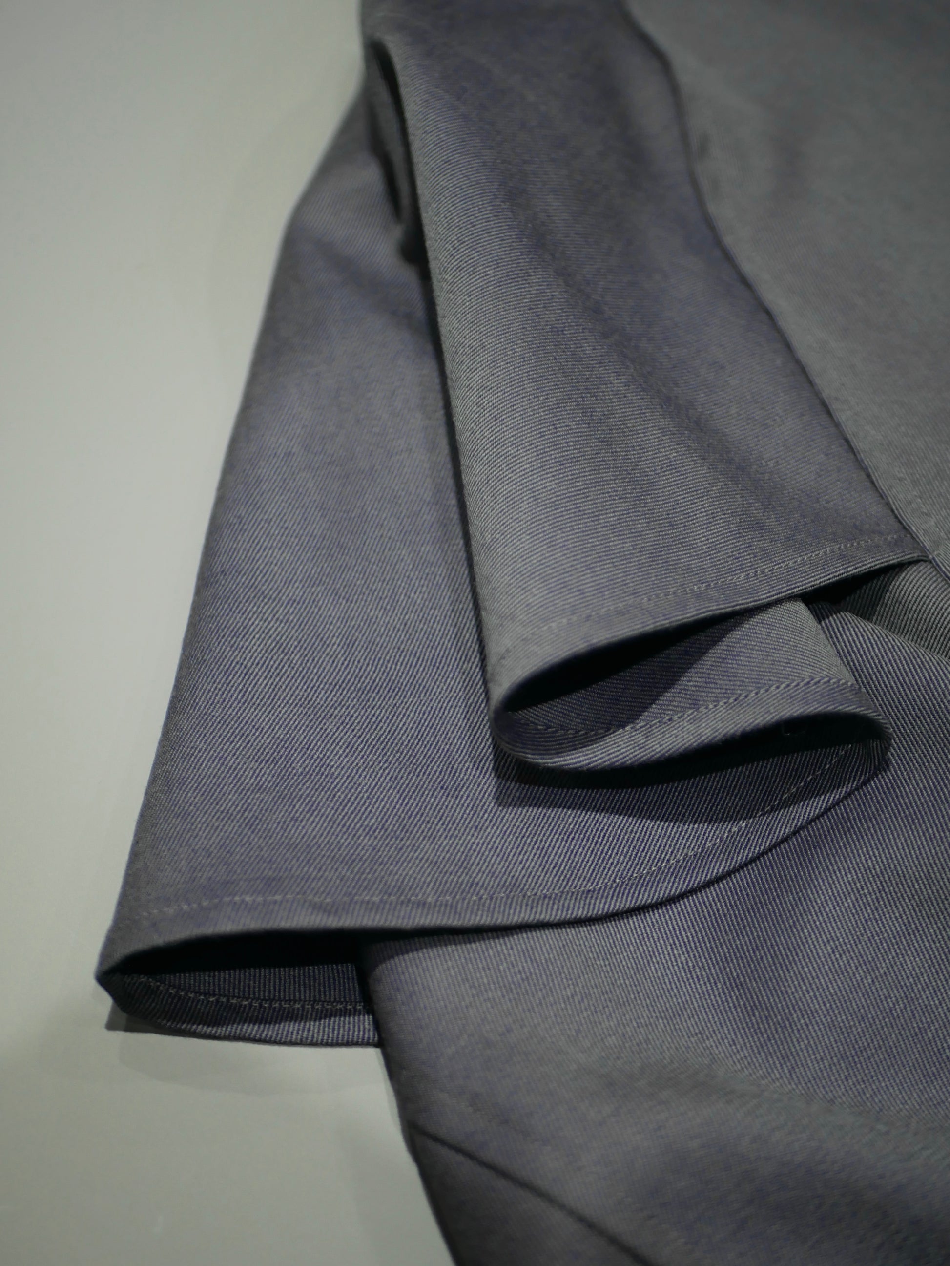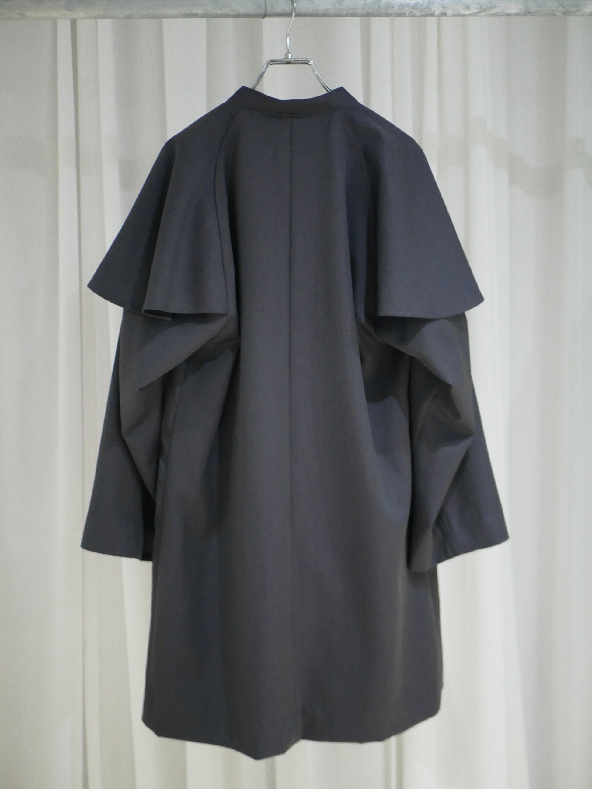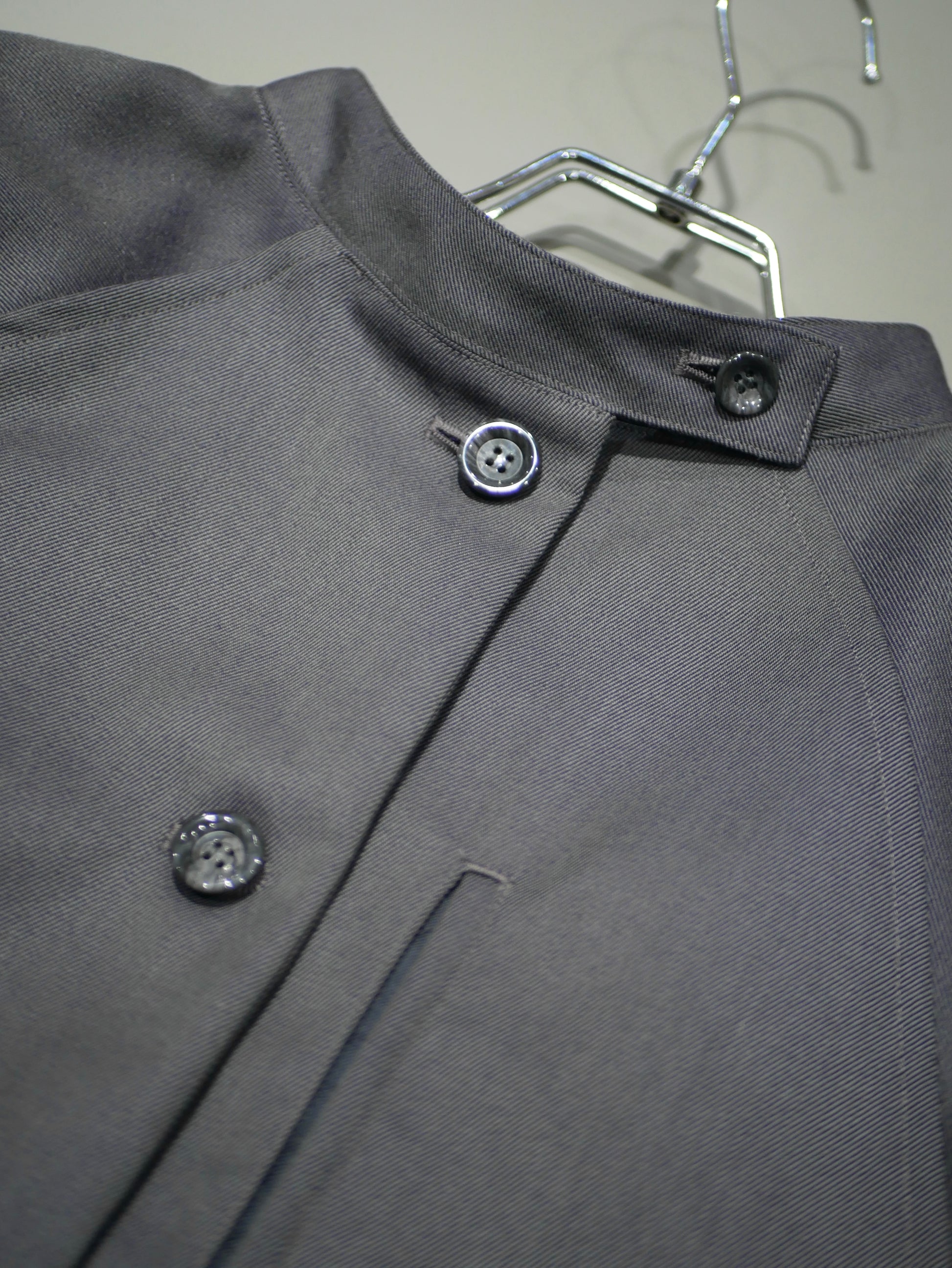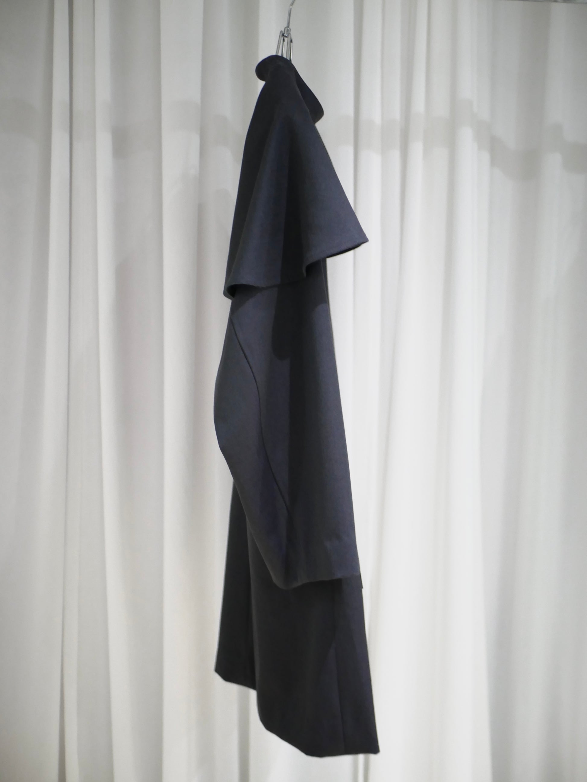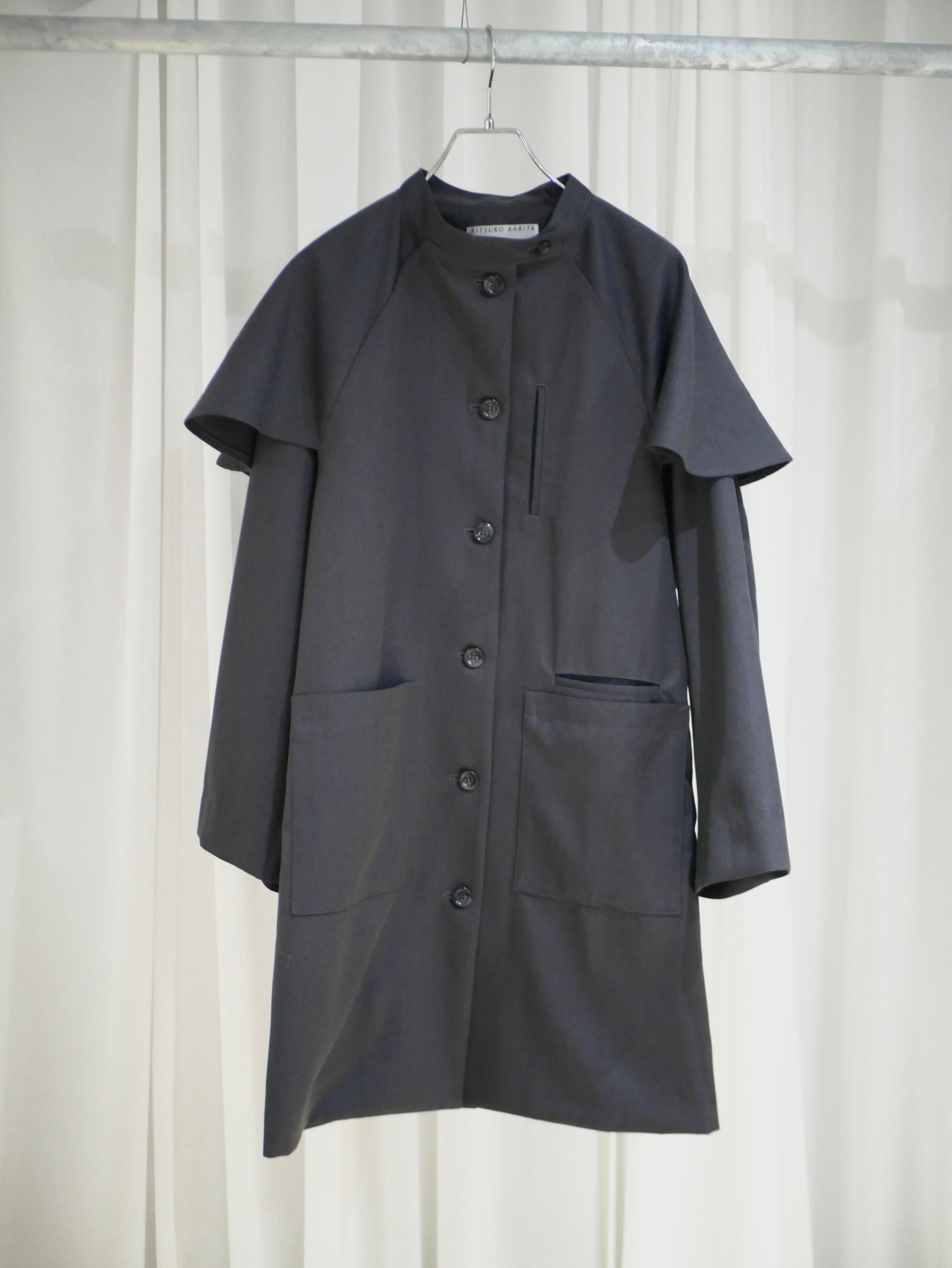 ワンピースのようなシルエットに、肩のフレアが印象的なコンパクトアウター。ボタンやポケット、素材感にはメンズライクな要素を取り入れています。パープルグレーはオリジナルウール、ブラックはコーデュロイ。(ブラックは別ページにございます)