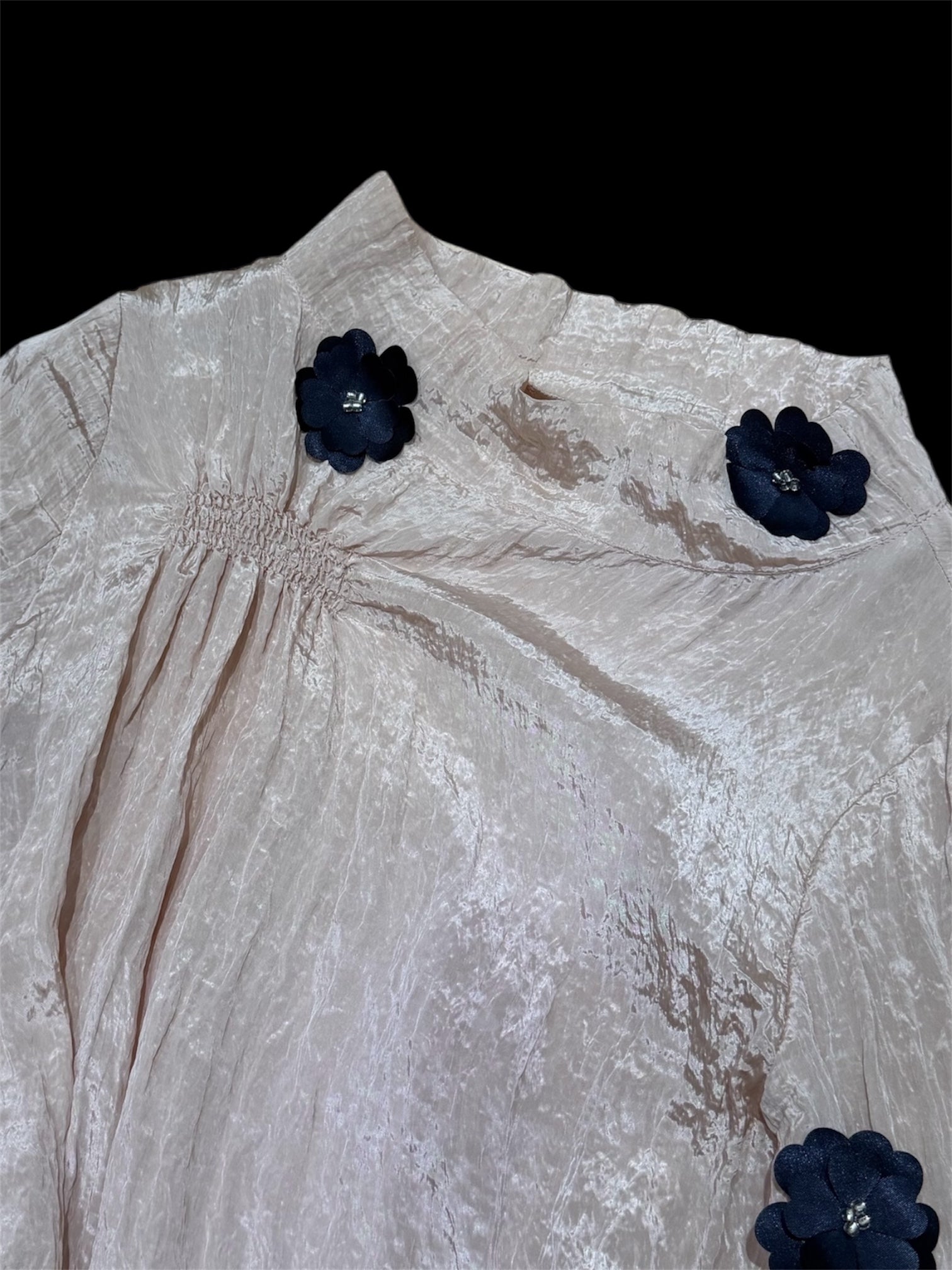 21SSコレクションで発表したトップスに、24AWのムードを先取りし、1点ずつ手縫いで花飾りをあしらいました。すべてが一点ものの特別なアイテムです。